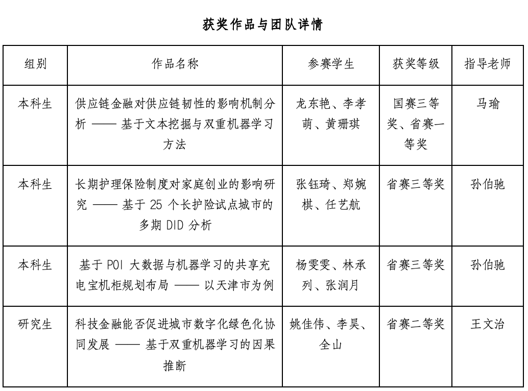 本次競賽中,經濟學院團隊圍繞經濟社會發展熱點,將經濟學理論與統計建模方法、機器學習技術、數據挖掘工具深度融合,形成“人工智能 + 統計學 + 經濟學”多學科交叉研究范式。參賽作品聚焦供應鏈韌性、家庭創業等議題,兼具學術前沿性與現實價值。此次成績的獲得既印證了經濟學院學子的專業素養與創新實踐能力,也體現了經濟學院近年來深化學科建設、推進教學改革、探索復合型人才培養模式的成果。
