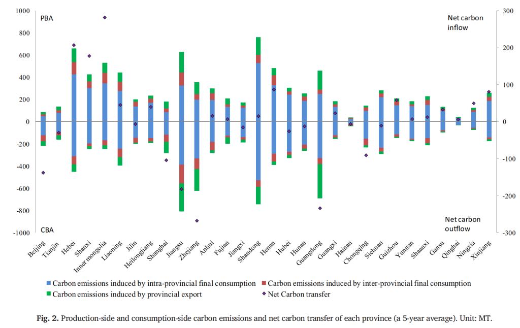 論文基于中國省域間投入產(chǎn)出數(shù)據(jù)和中國碳核算數(shù)據(jù)庫(CEADs)的碳排放數(shù)據(jù),采用多區(qū)域投入產(chǎn)出模型(MRIO)測算了2007年至2017年中國30省域的雙側(cè)碳排放量,并運用SDA方法對省域雙側(cè)碳排放的影響因素實施分解。研究結(jié)果表明:我國中部和北部省域呈現(xiàn)凈碳流入,而東部和南部沿海地區(qū)省域呈現(xiàn)凈碳流出,區(qū)域間存在較高的隱含碳流動,進而使得生產(chǎn)責(zé)任原則和消費責(zé)任原則下界定的省域碳排放量存在巨大差異。技術(shù)效應(yīng)是抑制雙側(cè)碳排放增加的重要因素,但其貢獻率呈下降趨勢。結(jié)構(gòu)效應(yīng)對雙側(cè)碳排放增加具有顯著的制約作用,且貢獻率逐漸增加。
