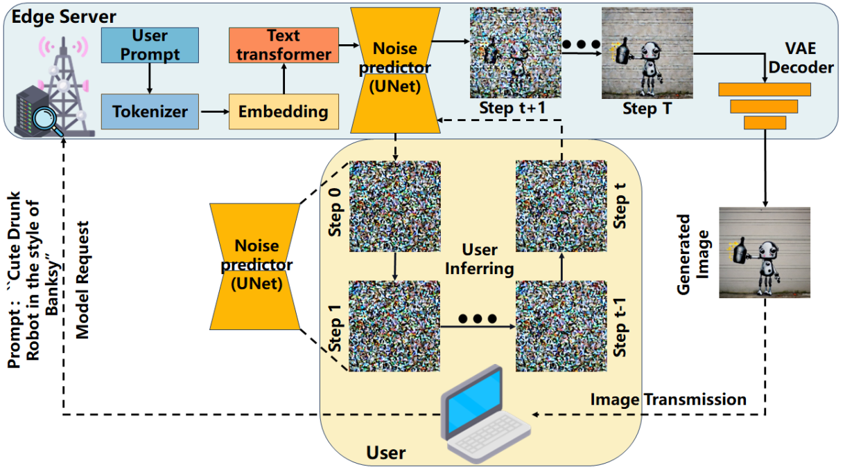 隨著生成式人工智能技術與邊緣云網絡的快速發展,AIGC服務的需求與日俱增,擴散模型憑借其強大的“文生圖”的能力脫穎而出。然而,其較高的計算開銷對用戶設備構成嚴峻的挑戰。為此,項目組提出了一種基于擴散模型的新型邊緣用戶協作推理框架,通過設備間的計算協作推理,減少了服務延遲、降低了網絡資源消耗和用戶計算資源消耗,同時提升了用戶體驗質量(QoE)。實驗結果表明,該框架不僅能夠生成高質量圖像,還能顯著節約圖像生成時間,有效優化計算資源和網絡消耗。