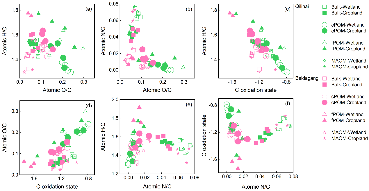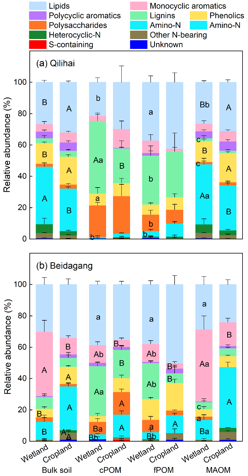 濱海濕地具有重要的生態(tài)系統(tǒng)服務(wù)功能,包括巨大的碳庫和很高的碳匯能力。然而,濕地不同粒級有機質(zhì)(SOM)的化學(xué)組成及其對長期開墾的響應(yīng)機制尚不清楚。本研究以渤海灣濱海濕地(七里海和北大港)為研究區(qū),基于粒級分組得到粗顆粒(cPOM,>250μm)、細(xì)顆粒(fPOM,53-250μm)和礦質(zhì)結(jié)合有機質(zhì)(MAOM,<53μm),采用熱裂解-氣相色譜/質(zhì)譜技術(shù)分析了不同淹水條件濕地開墾為后有機質(zhì)化學(xué)組成及其空間分異規(guī)律。我們發(fā)現(xiàn),北大港濕地中微生物衍生的含N化合物顯著高于七里海濕地,這與不同的淹水條件有關(guān)。七里海濕地開墾降低了MAOM中含N化合物(?28%)的相對豐度,卻提高了脂類(+17%)和酚類(+40.7%)的相對豐度。北大港濕地開墾降低了三個粒級組分中單環(huán)芳烴的相對豐度(?60.3% ~ ?70.2%),提高了含N化合物的相對豐度(+175% ~ +407%)。相比之下,濕地開墾后SOM的化學(xué)組成呈現(xiàn)趨同性。綜上,SOM化學(xué)組成的分異及變化趨勢既受到粒徑的調(diào)控,同時也受控于濕地初始的淹水條件。