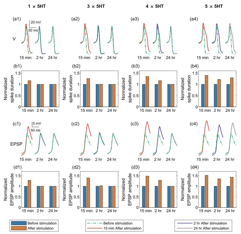 軟體動物海兔的突觸易化有三個階段:短期易化、中期易化和長期易化。短期易化的誘導不依賴基因表達,中期易化的形成需要蛋白質合成,而長期易化的形成需要新的蛋白質和RNA的產生。由于基因轉錄和蛋白質翻譯過程消耗較長的時間,導致長期突觸易化的延遲發生。為了研究突觸易化的三個階段,本文提出了一個多尺度的數學模型,包括細胞內基因轉錄與蛋白質合成、突觸前細胞膜電位和興奮性突觸后電位。基于模型中存在的正反饋回路,利用分岔分析得到系統具有雙穩性,因此適當的刺激能夠引起系統在不同的狀態間轉遷。通過采用不同的刺激方案,模型實現了短期易化、中期易化和長期易化的現象,并且模擬了中期易化對翻譯過程的依賴,以及長期易化對轉錄和翻譯的依賴,數值模擬結果與生物實驗結果一致。