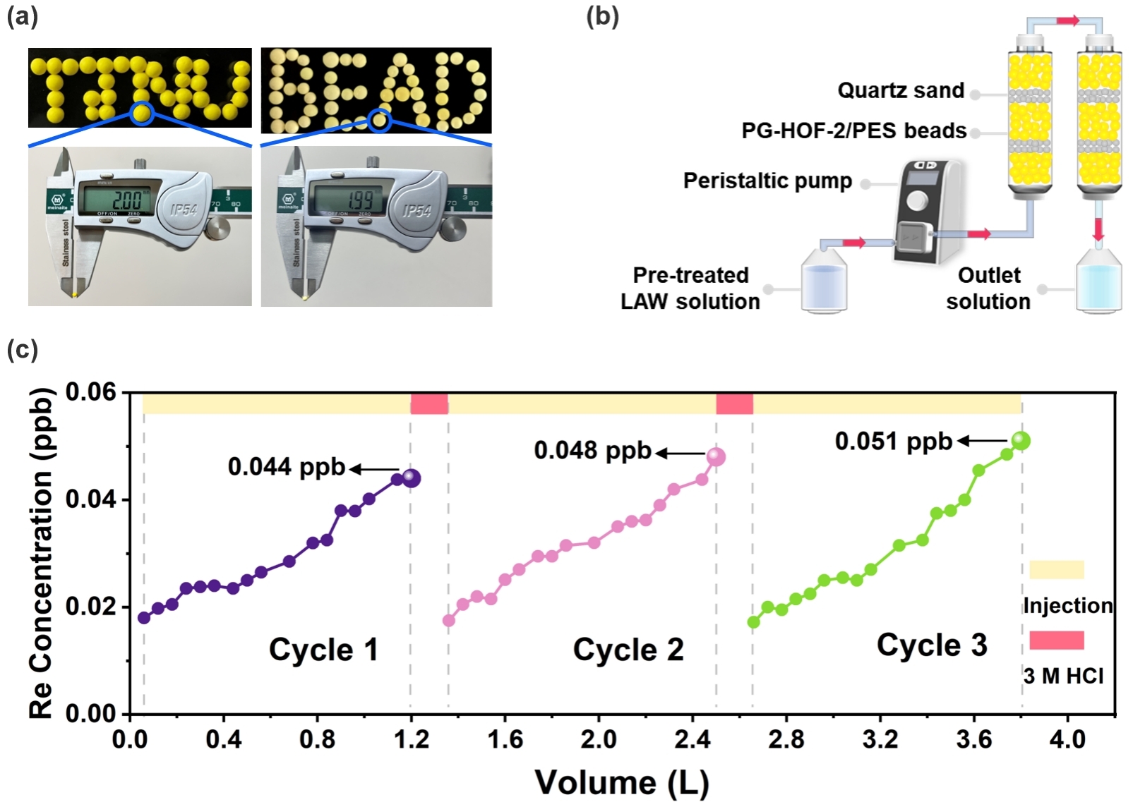 為驗證其實際應用潛力,研究團隊進一步開展了動態吸附柱實驗。結果顯示,1.0 g PG-HOF-2/PES復合珠可連續處理4.8 L預處理低放廢液(LAW),凈化后Re/Tc濃度遠低于世界衛生組織(0.159 ppb)規定的飲用水標準,僅為商業樹脂處理后核素濃度的千分之六(同等條件下,溶液經商用樹脂Purolite A530E處理后,殘留Re濃度為8.498 ppb)。更為關鍵的是,PG-HOF-2/PES復合珠經多次吸附-脫附循環后仍保持穩定吸附性能,凸顯了其在真實廢水處理場景中的應用可靠性。此外,該研究中的所有CPF-X/PES復合珠對預處理廢液的凈化效果均顯著優于原始粉體材料,證實了該策略的廣泛適用性。