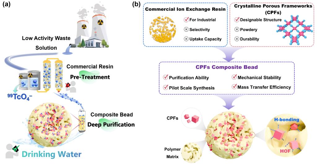 面向痕量核廢水凈化需求及粉體材料規模化應用瓶頸,天津師范大學化學學院李程鵬教授團隊通過造粒成型策略,將功能化晶態粉末(PG-HOFs、P-COFs和P-MOFs)與高分子基質復合,成功制備了用于捕獲放射性核素陰離子(99TcO4–)的34種晶態多孔框架復合珠(CPFs Beads),有效提升了其在連續流、復雜廢水體系下的實用性能。該成果以“Facile structuring of crystalline porous framework beads for deep purification of nuclear wastewater”為題,于2025年3月5日發表在National Science Review上。