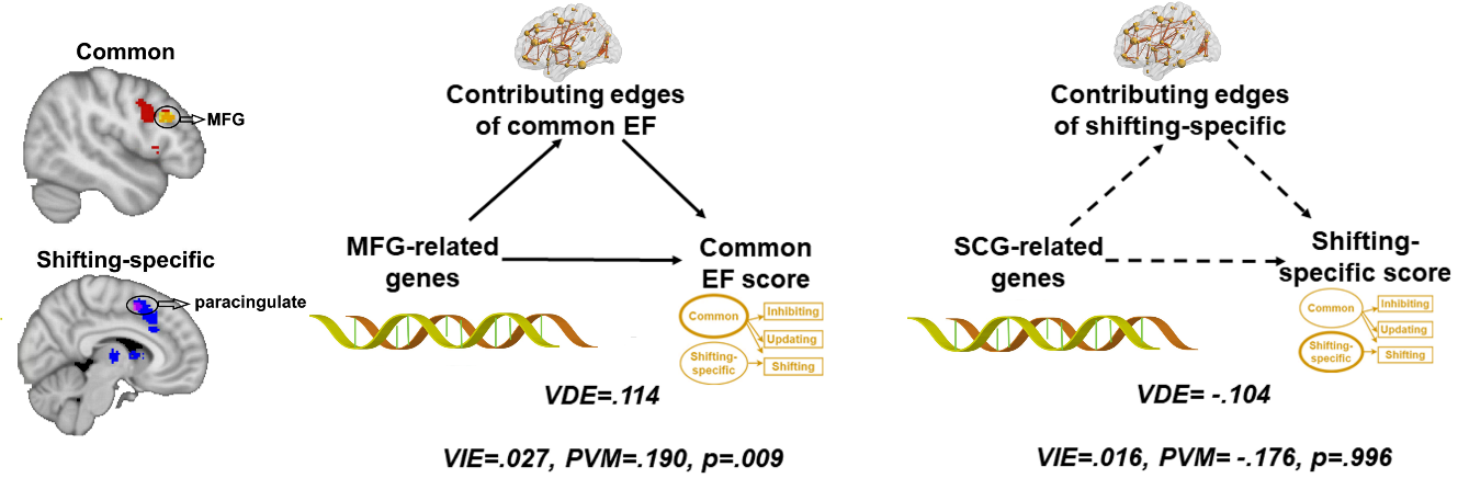 上述結果顯示"C+S"模型中的成分在行為、神經和基因水平上是分離的。在最后的分析中,作者應用了高維中介模型來進行“基因-大腦-執行功能成分”通路分析。結果表明,在額中回表達增強的基因通過調節該腦區的功能連接進而影響執行功能共同成分的得分。