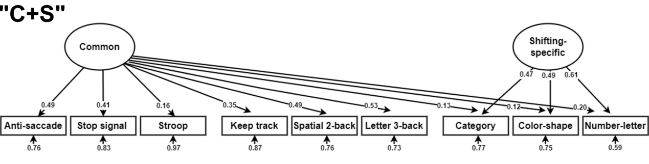 首先,為了全面考察EFs的結構,作者比較分析了基于三種最常討論的EF成分(即抑制[I]、更新[U]和轉移[S])的所有可能的12個候選模型,得到了五個具有良好擬合參數的模型。該結果不僅重復了之前受到廣泛關注的兩個模型:“抑制+更新+切換”模型(I+U+S),“共同+更新特異性+切換特異性”模型(C+U+S);而且拓展考察了由共同成分和一個特異性成分組成的模型,并且發現“共同+切換特異性”模型(C+S)擬合良好。