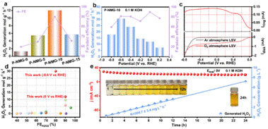 開發的富吡咯氮摻雜的石墨烯介孔碳復合材料表現出極佳的2e?-ORR性能,在?0.6 V vs. RHE的測試電位下,達到30 mol g?1 h?1的H2O2產率,同時表現出80%的法拉第效率。24h的長時長測試可以積累得到7.2 g L?1的H2O2(圖1)。理論結果表明:雙吡咯氮活性中心比石墨氮、吡啶氮和單吡咯氮相比會具有更小的反應過電位。而雙吡咯氮活性中心的兩電子反應能壘遠低于四電子反應,從而表現出更高的催化性能。
