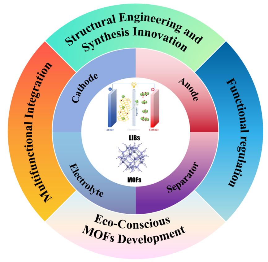 本綜述全面介紹了金屬有機框架(MOFs)在推動鋰離子電池(LIBs)發展中的變革潛力,重點探討其作為電極、電解質和隔膜的多功能應用。MOFs獨特的結構特性——如可調孔隙率、高比表面積和可定制的化學功能——能夠顯著提升電池的能量密度、離子傳輸效率和熱穩定性。本綜述系統闡釋了MOFs及其衍生物在鋰離子電池四大核心組件——正極、負極、電解質和隔膜中的創新應用機制與性能優化策略。盡管取得這些進展,MOFs材料固有的低導電性、循環過程中的結構降解以及高昂的生產成本仍是關鍵障礙。針對這些局限性,本文提出了戰略性研究方向,包括構建導電網絡、開發多功能雜化材料以及探索可持續合成方法,并為利用MOFs設計具有更高性能、安全性和環境可持續性的下一代鋰離子電池提供了路線圖。