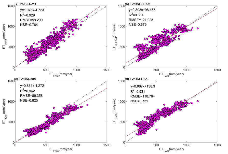 圖1 ETAWB、GLEAM、Noah、ERA5相對于ETTWB的回歸散點圖