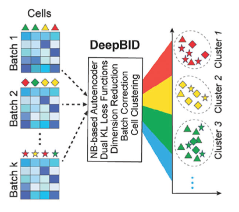 隨著不同實驗室、不同實驗環境或不同實驗協議生成的相同組織或細胞系的大規模單細胞轉錄組數據集,對這些數據集進行去噪以消除批次效應,確保生物問題的準確解釋和全面分析至關重要。因此,單細胞組學數據整合分析成為生物和醫學領域重要的問題之一。為此,項目組設計了一種新的基于深度學習的解決方案DeepBID,用于多批次單細胞組學數據的整合和去噪。DeepBID不僅可以糾正批次效應,還可以同時實現非線性降維、嵌入和聚類,與現有方法相比具有卓越的性能。實驗表明DeepBID在阿爾茨海默病研究中顯著增強了細胞聚類、細胞注釋和差異表達基因鑒定方面的能力。