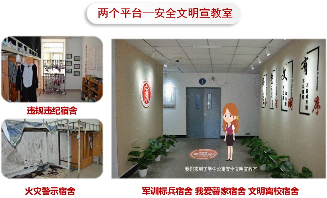 在線下,以“從這里寓見更好的自己”為主題,在學生公寓14號樓實景打造軍訓標兵、文明離校、我愛馨家、火險警示、違規違紀五間主題宿舍,將公寓文化活動宣傳和規章制度宣講融入其中,通過每年組織新生實地參觀學習,親身感受,增強學生的歸屬感,讓公寓教育更加直觀、生動,富有成效。師者德行,踐行立德樹人本責,不斷推進公寓思政教育創新,構建公寓育人體系也是他孜孜不倦的追求。