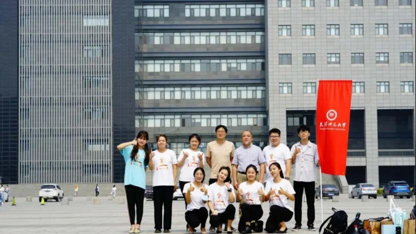徐錕(后排右三)在天津師范大學圖書館前與賈濰(后排左四)老師、胡東寧(后排右三)老師以及同學們合影