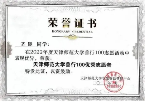 2021年考入天津師范大學后,齊際不僅在學業上刻苦鉆研,更在學生工作與志愿服務中綻放出耀眼光芒。作為班級團支書,他盡心盡力為同學們服務,組織主題團日活動,用真誠帶動他人、凝聚班級;作為學校自強社負責人,他帶領社員們開展幫扶活動,為家庭困難的同學送去關懷,用行動詮釋著“自強”與“互助”的意義。